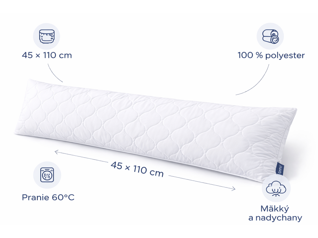 Dopřejte si maximální pohodlí během spánku i odpočinku s dlouhým polštářem Emma. Tento měkký a nadýchaný polštář je ideální nejen pro spaní, ale také pro relax, čtení či jako podpora pro celé tělo. Díky svému prodlouženému rozměru poskytuje dokonalou oporu hřbetu, nohou i krku.