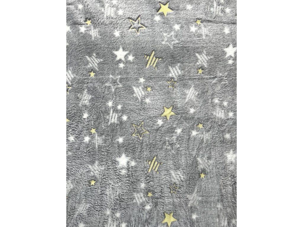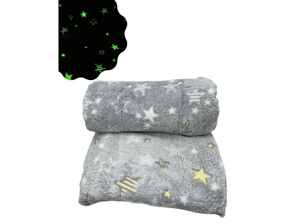 Deka má šedý podklad a bílé, žluté hvězdy, které. přes den jsou nabité sluncem a ve tmě svítí.
