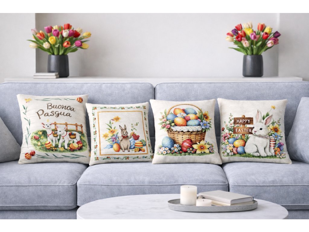 Oživte svůj domov jemnou jarní atmosférou s dekorativním velikonočním povlečením na polštář v elegantním gobelínovém provedení. Veselé velikonoční motivy jako zajíčci, ovečky, květiny či barevné kraslice vnesou do interiéru svěžest a pravou sváteční náladu. 🐥🌷